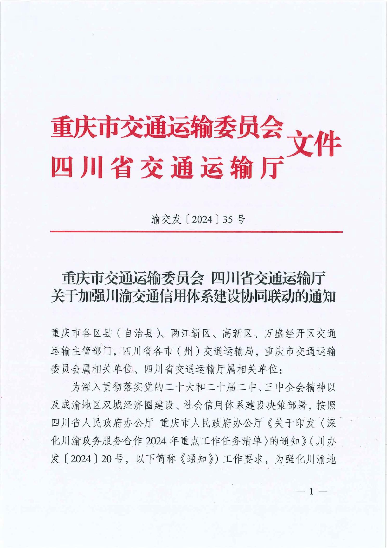 重慶市交通運輸委員會 四川省交通運輸廳關于加強川渝交通信用體系建設協同聯動的通知">