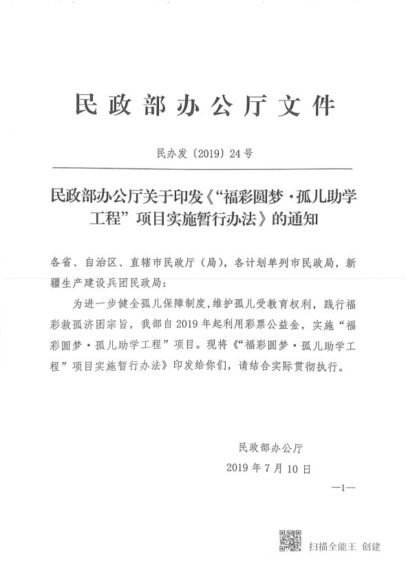現(xiàn)將民政部辦公廳《關(guān)于印發(fā)〈“福彩圓夢·孤兒助學(xué)工程”項目實施暫行辦法〉的通知》(民辦發(fā)〔2019〕24號)轉(zhuǎn)發(fā)給你們,并提出我市的貫徹意見,請一并遵照執(zhí)行。