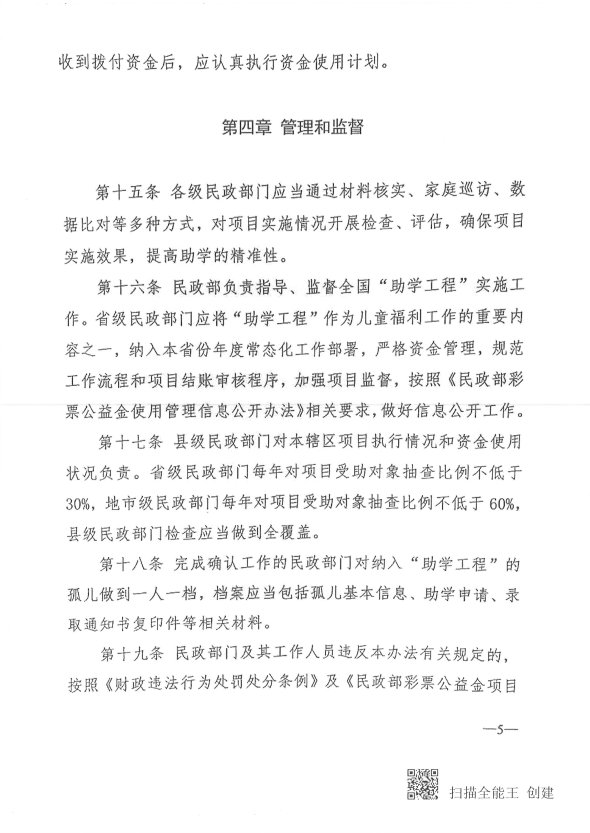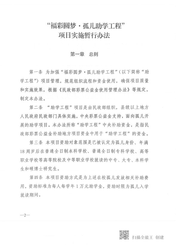 從2019年7月10日起,民政部實施的“福彩圓夢·孤兒助學(xué)工程”項目,是進(jìn)一步健全孤兒保障制度,維護(hù)孤兒受教育權(quán)利的重要舉措。各區(qū)縣(自治縣)要高度重視,認(rèn)真組織實施。要利用互聯(lián)網(wǎng)、媒體等平臺,大力宣傳《“福彩圓夢·孤兒助學(xué)工程”項目實施暫行辦法》(以下簡稱《暫行辦法》),做到家喻戶曉。
