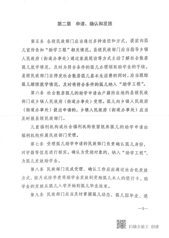 社會散居孤兒向戶籍所在地鄉(xiāng)鎮(zhèn)人民政府(街道辦事處)提交書面助學(xué)申請,鄉(xiāng)鎮(zhèn)人民政府(街道辦事處)從受理之日起,5個工作日內(nèi)提出初審意見并報區(qū)縣民政局,區(qū)縣民政局應(yīng)在5個工作日內(nèi)負(fù)責(zé)確認(rèn)孤兒身份,對學(xué)籍等信息進(jìn)行核實。確認(rèn)為受助對象的,納入“福彩圓夢·孤兒助學(xué)工程”。