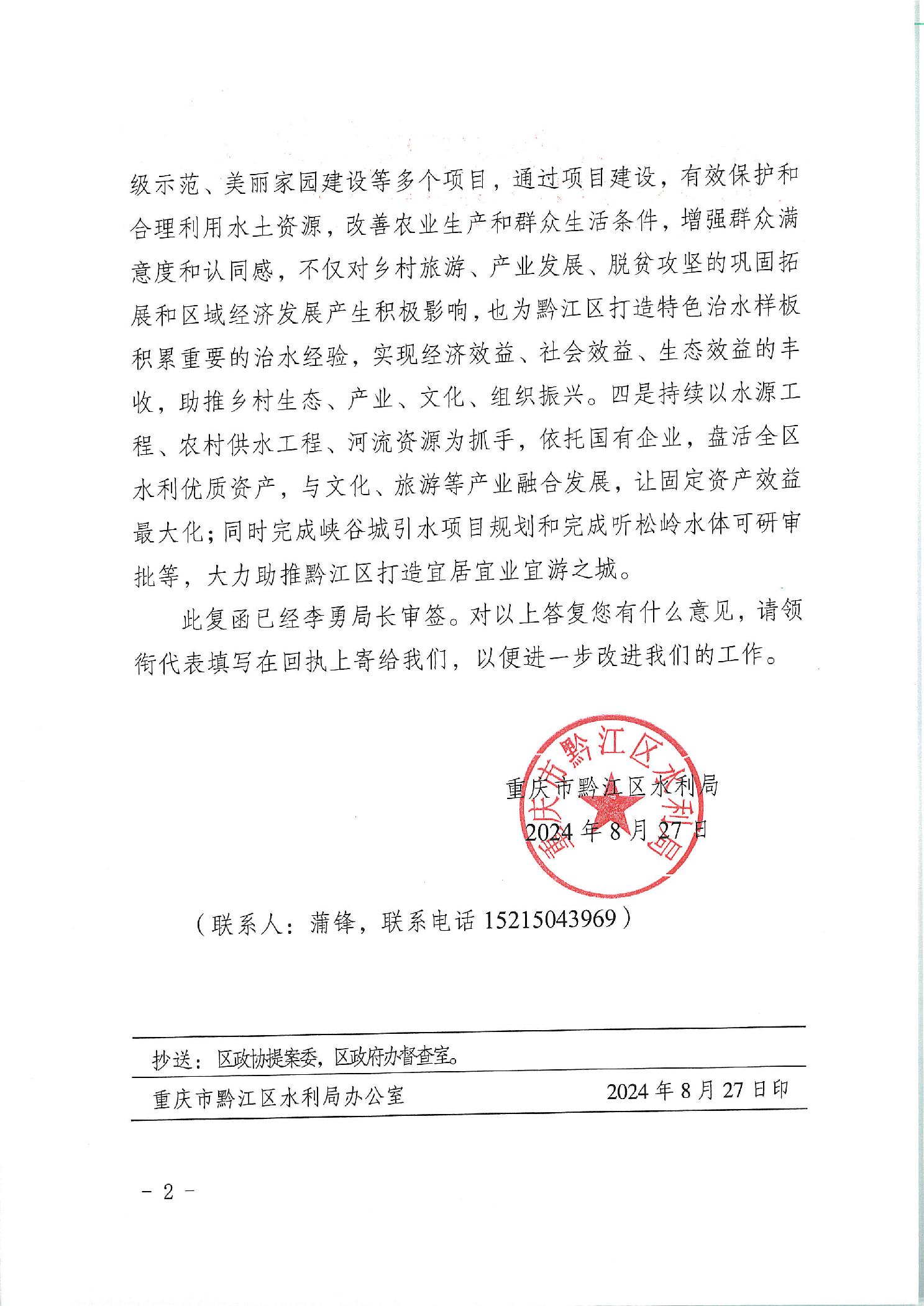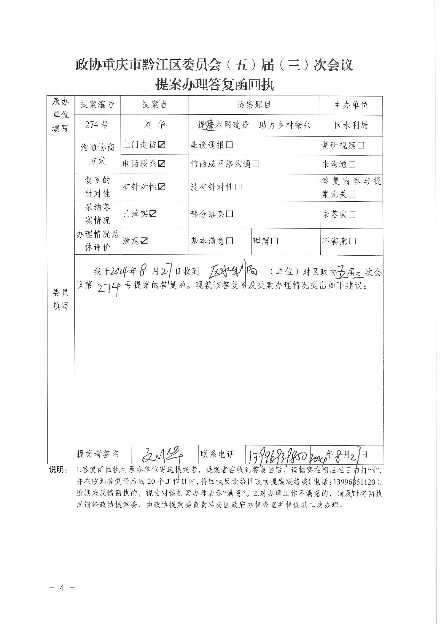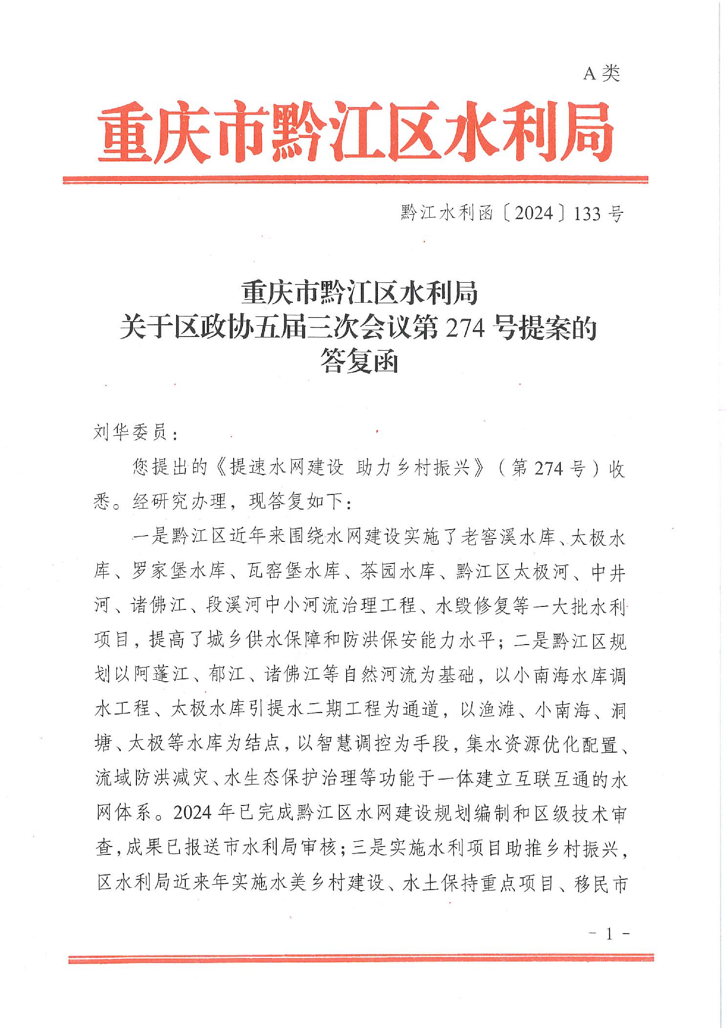 重慶市黔江區(qū)水利局關于政協(xié)五屆三次會議第274號提案的答復函
