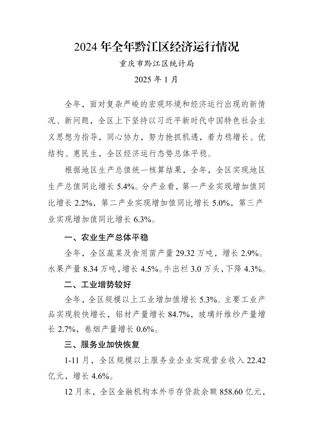 2024年全年黔江區經濟運行情況">