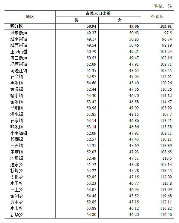根據黔江區第七次全國人口普查結果,現將2020年11月1日零時我區30個鄉鎮街道的人口性別構成情況公布如下: