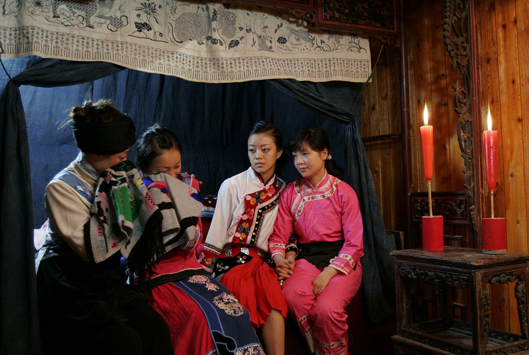 土家族歷史上的婚姻比較自由,男女雙方經過自由戀愛,征得雙方父母同意,經土老師(巫師)作證,即可結為夫妻。黔江曾有骨種婚、扁擔親、開調親、坐床和填房等極具地方特色的婚俗,這些舊習在清光緒年間被官府要求廢除,開始推行漢族婚俗禮儀,推行“納采、問名、納吉、納征、請期、親迎”六禮,講究“父母之命,媒妁之言”。“改土歸流”以后,土家族婚俗雖然已逐漸接近當地漢民習俗,但也保留了一些本民族特點,被列入市級非物質文化遺產名錄。如今,傳習至今的土家族傳統婚俗主要有提親、認親、討庚、哭嫁、迎親、拜堂、坐床、回門等,其中以哭嫁習俗最具特色,哭嫁歌亦歌亦哭,句式自由,感染力強。