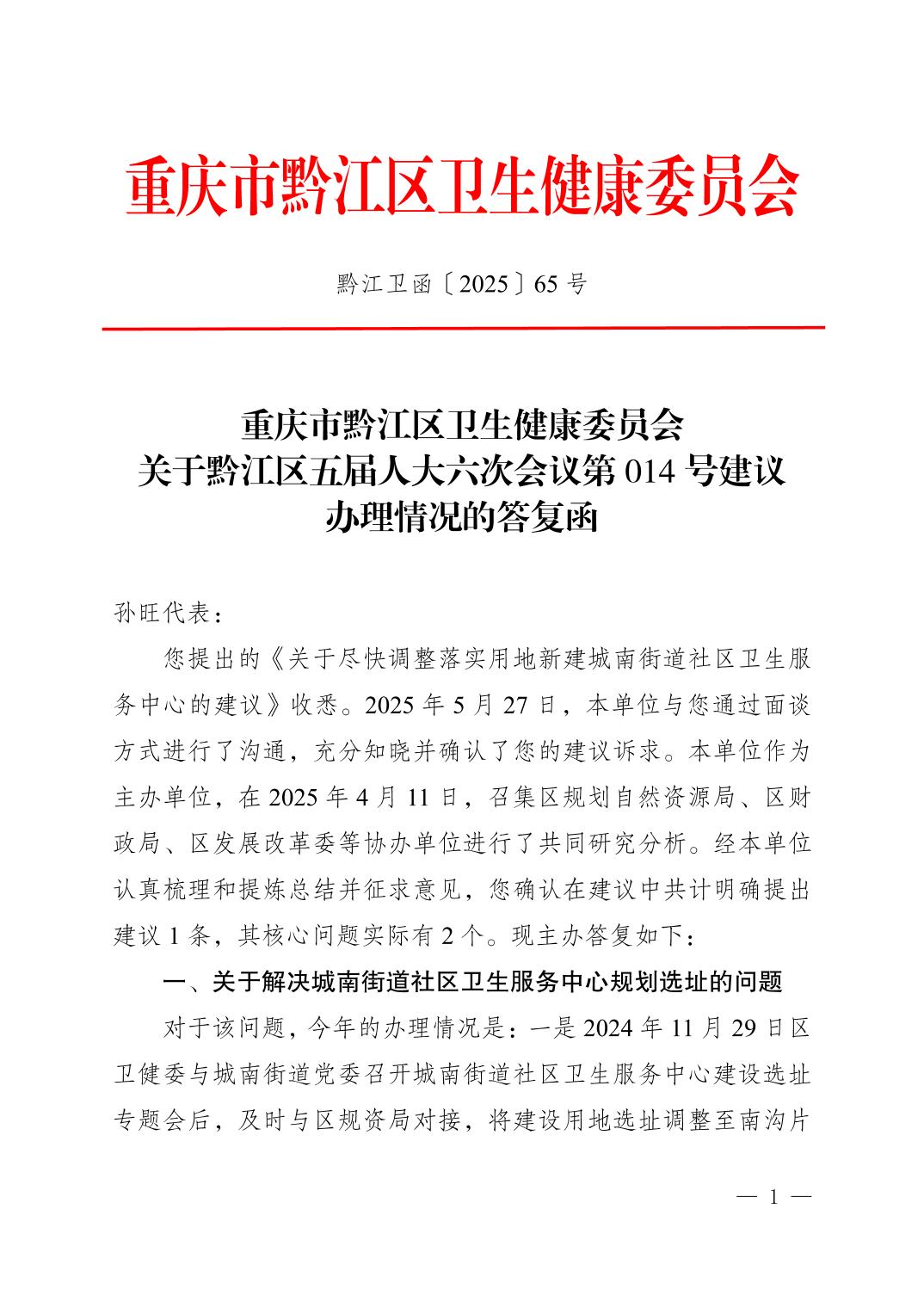 重慶市黔江區(qū)衛(wèi)生健康委員會關(guān)于黔江區(qū)五屆人大六次會議第014號建議辦理情況的答復(fù)函