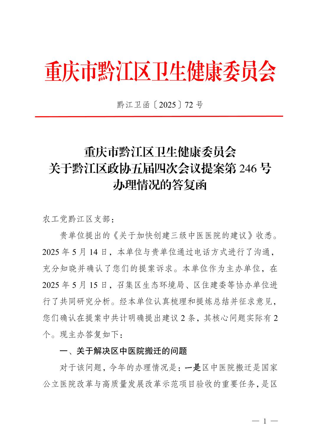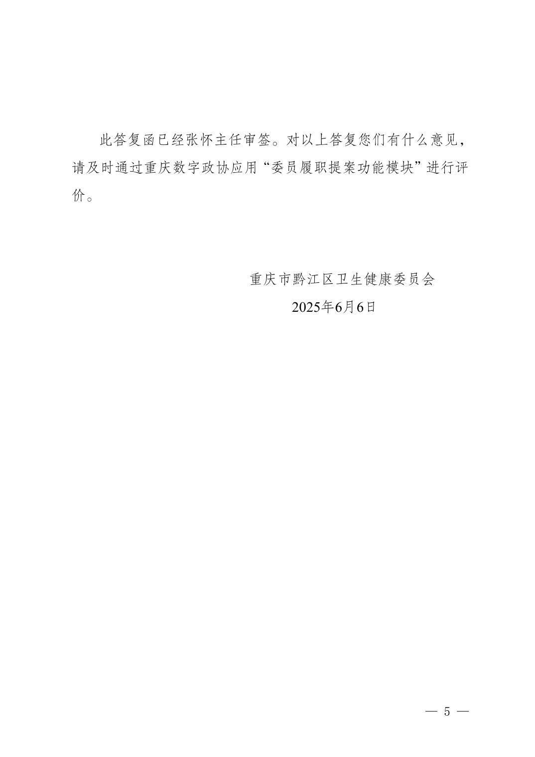 重慶市黔江區衛生健康委員會關于黔江區政協五屆四次會議提案第246號辦理情況的答復函
