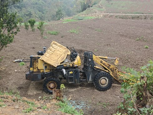 事故地點位于重慶市黔江區(qū)馮家街道寨子社區(qū)6組高標準農(nóng)田建設項目機耕道1,該機耕道1路寬4.3米,可行路面寬度3米,事發(fā)路段坡度28°,無道路標志標線,干燥的泥巴路面,路面不平整,入口處旁可見“前方施工、禁止通行”字樣的標牌。