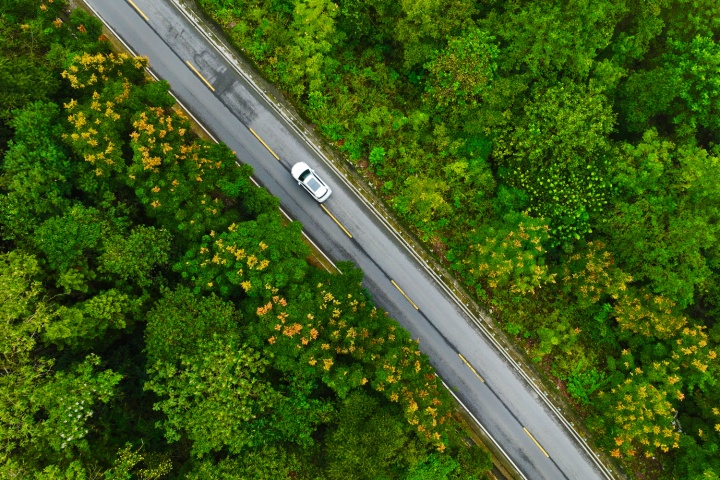 近日,自駕游車行駛在欒樹花掩映的通往小南海景區(qū)的公路上。