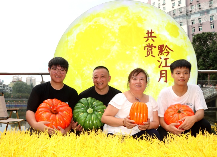 游客抱著“大南瓜”共賞黔江月