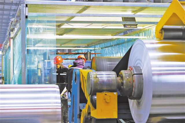 工人們?cè)谇咝聟^(qū)一再生鋁加工企業(yè)的生產(chǎn)線(xiàn)上忙碌